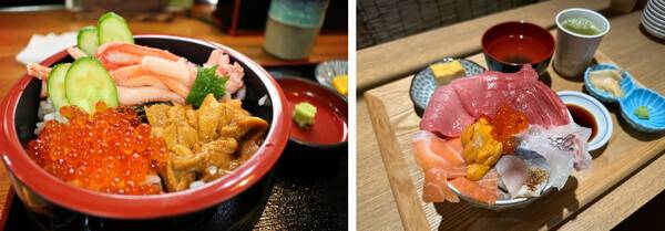 초밥도 유명하지만 성게, 연어알, 참치, 가리비, 새우, 게 등 수많은 해산물이 듬뿍들어간 카이센동 덮밥은 어떠신가요? 신선한 해산물이 씹히며 숟가락으로 밥을 풀 때마다 다른 해산물이 딸려 올라와 수많은 맛을 느낄 수 있습니다.