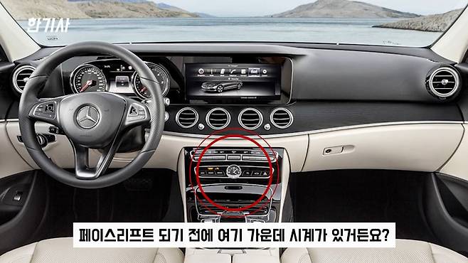 페이스리프트 되기 전에 가운데 시계가 있었거든요. 근데 시계가 지금은 없어졌어요. 벤츠가 진짜 못된 게 저도 솔직히 그 감성 때문에 샀는데, 밉더라고요. 원래 시계가 페이스리프트 전에는 있다가 페이스리프트가 되면서 시계업체와 계약 기간이 만료가 돼서 뺐다고 하더라고요. 그 시계를 얼마나 많이 볼까 싶은데, 솔직히 있고 없고의 차이는 많이 큰 거 같아요.