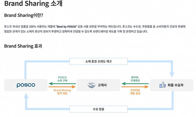 포스코는 2019년부터 수도관, 주방용품 등 소비자들의 건강과 위생에 밀접한 관계가 있는 소재의 원산지 정보가 투명하고 정확하게 소비자들에게 전달될 수 있도록 브랜드쉐어링 제도를 기획해 운영하고 있다.