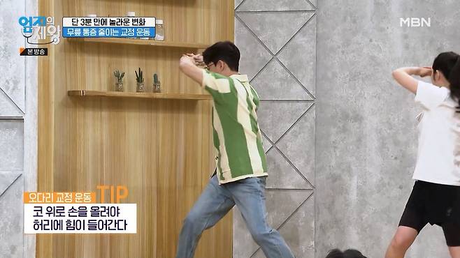 1단계보다 다리를 두 보 넓게 벌립니다!