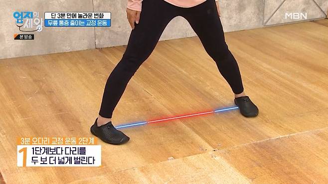 1단계보다 다리를 두 보 넓게 벌립니다!