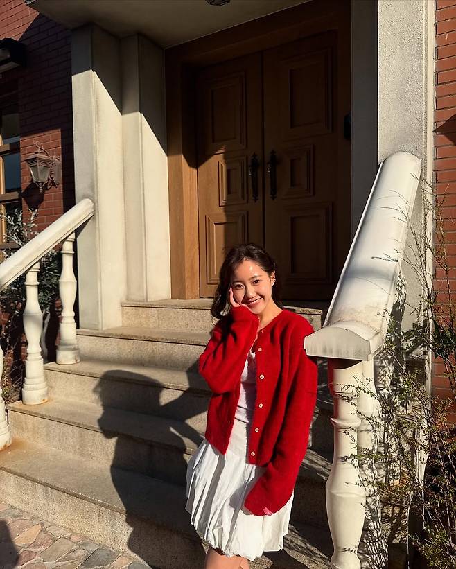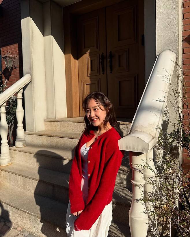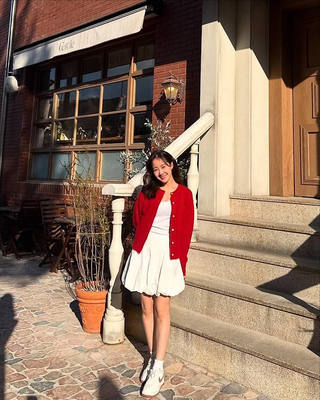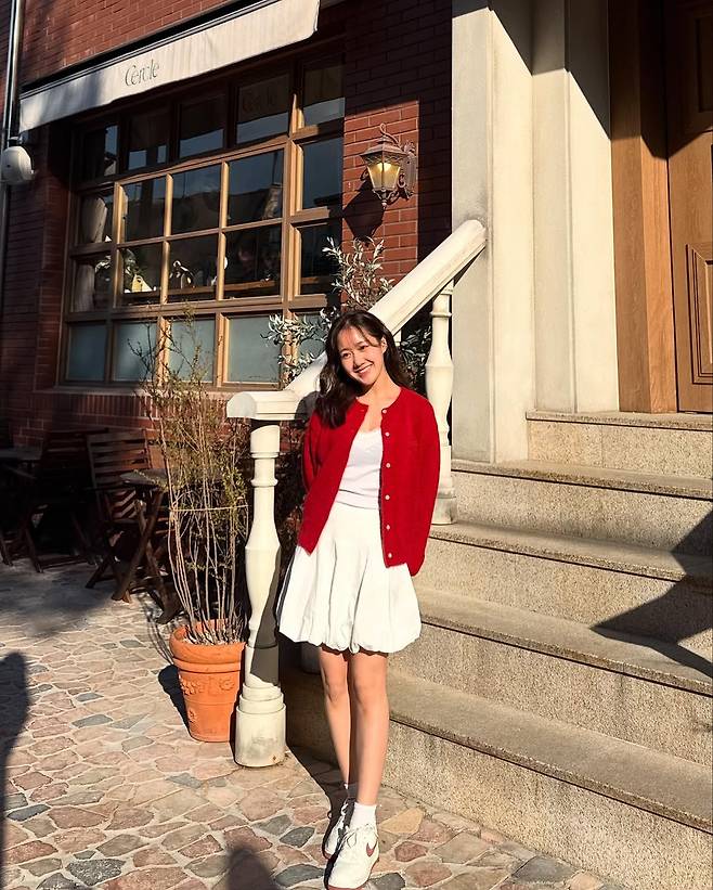 여기에 강렬한 레드 컬러의 니트 가디건을 포인트로 더해 로맨틱하면서도 캐주얼한 밸런스를 절묘하게 잡았다.