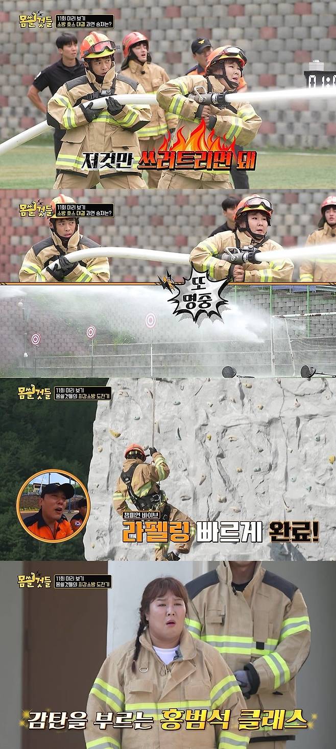 제작진에 따르면 '몸쓸것들' 멤버들은 소방 호스 타깃 맞추는 미션에 나선다. 엄청난 무게의 소방 호스를 들고 타깃을 가장 빠른 시간에 맞히는 팀이 이기는 미션. 꼴찌 팀은 소방관 착장을 유지한 채 운동장 5바퀴를 뛰어야 한다.