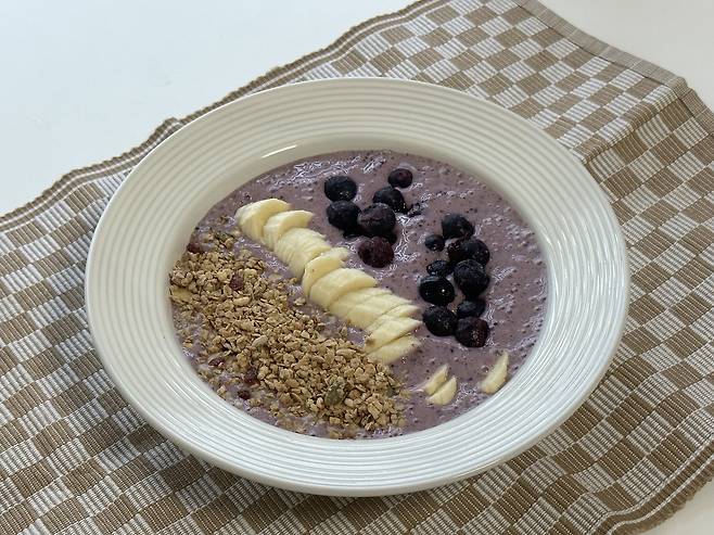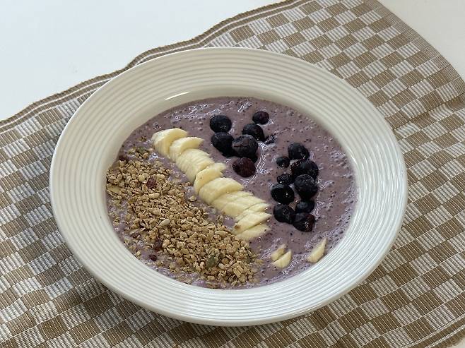⑥ 그래놀라, 슬라이스한 바나나, 냉동블루베리를 얹어 예쁘게 토핑해줍니다. 다른 제철과일을 더해준다면 더 예쁘고 맛있겠죠?