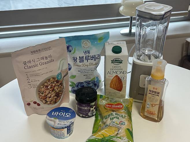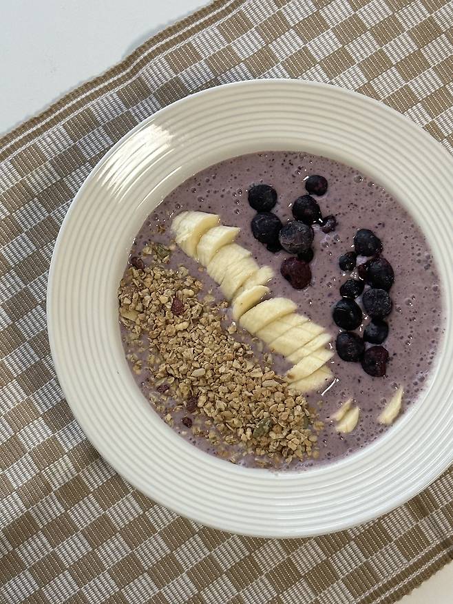 그래놀라 / 그릭요거트 / 아사이베리가루 / 바나나 두개 / 아몬드우유 / 꿀 / 냉동블루베리