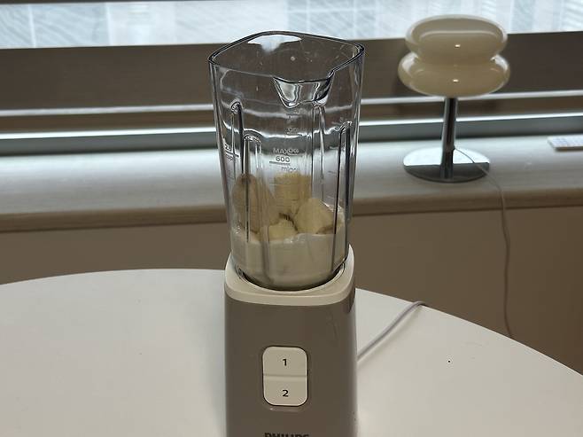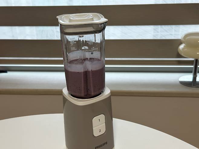 ④ 이제 믹서기 뚜껑을 닫고, 휘리릭 갈아줍니다.