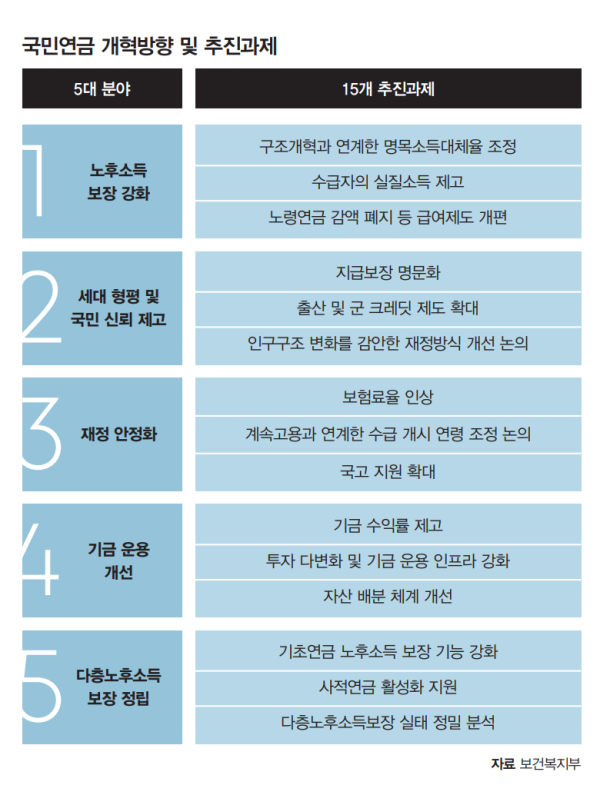 정부의 3대 개혁과제 중 하나인 연금개혁을 위한 청사진이 나왔습니다. 국민연금 보험료율은 올리되 세대별 형평성을 고려해 인상 속도를 달리 적용하는 방안을 추진합니다. 아울러 연금기금이 고갈돼도 국가가 지급한다는 내용은 법률로 명문화해 국민의 우려를 불식시킵니다. 기초연금을 40만 원으로 인상하는 등 노후소득보장 강화에도 주안점을 뒀습니다. 보건복지부는 10월 27일 국민연금 제3차 국민연금심의위원회를 개최하고 이 같은 내용이 담긴 제5차 국민연금 종합운영계획(안)을 심의·확정했습니다. 종합운영계획은 국민연금법에 따라 5년마다 재정계산을 토대로 의무적으로 수립하는 정부의 연금개혁안입니다. 이번 안은 10월 30일 국무회의를 거쳐 국회에 제출됐습니다. 국회는 앞으로 연금개혁특별위원회를 중심으로 개혁 방안을 논의합니다.