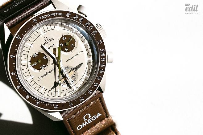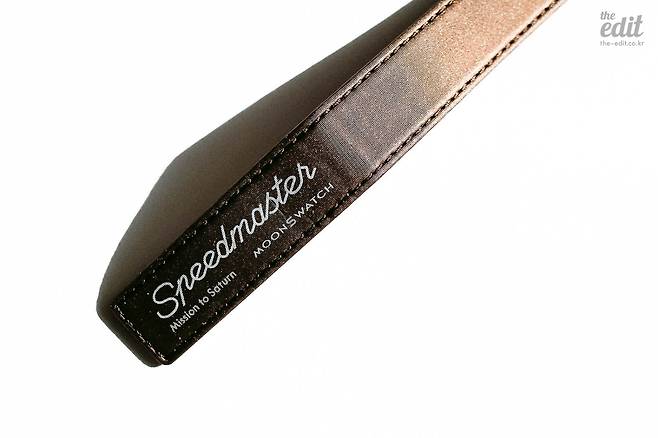 다이얼 디자인을 보자. 이 제품의 가장 큰 매력은 다이얼에 ‘오메가’ 마크가 새겨져 있다는 점이다. 오메가 밑에 ‘스와치’ 마크도 새겨져 있지만 크기 차이를 두어 오메가가 눈에 들어오게 했다. 그리고 스피드마스터 특유의 세 개의 크로노그래프(스톱워치)가 위치하고 있다. 문스와치는 오메가 스피드마스터의 다이얼을 3D 스캔해서 동일한 크기와 디자인으로 만든 모델이다. 특히 스와치 미션 투 더 문의 경우는 실제 오메가 스피드마스터와 색상 배합도 같아서 싱크로율이 높다고 한다. 그래서 미션 투 더 문의 리셀 가격이 가장 높은 편이다. 참고로 내가 가진 미션 투 새턴 모델은 세 번째 크로노그래프에 토성처럼 띠 모양이 그려져 있다. 다른 버전은 없는 새턴 버전만의 특유한 디자인이다.