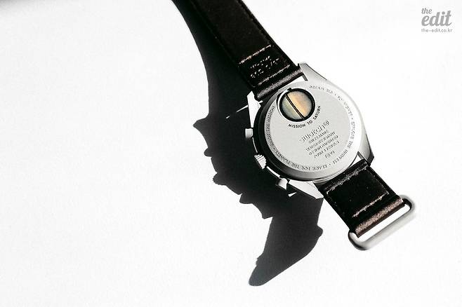 스트랩은 갈색이고 일반 천 재질인데 특이하게 벨크로 방식으로 고정된다. 이유는 있다. 우주복 위에 시계를 차려면 벨크로 소재가 유리하다고 한다. 물론 내가 우주복을 입을 가능성은 없고 그럴 기회가 있어도 우주로는 나가지 않을 것이며 무슨 임무를 수행하고 싶지는 않다. (‘그래비티’라는 영화를 봤기 때문이다) 하지만 이 시계 모델명이 미션 투 새턴 아닌가. 시계 이미지와는 잘 맞는 스트랩이다. 물론 가격도 엄청 저렴할 테고. 다만 스트랩이 시계 본체에 완전히 봉제돼 있기 때문에 다른 스트랩을 사용하려면 기본 스트랩을 잘라내야 한다.