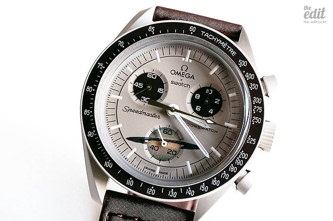 다이얼 디자인을 보자. 이 제품의 가장 큰 매력은 다이얼에 ‘오메가’ 마크가 새겨져 있다는 점이다. 오메가 밑에 ‘스와치’ 마크도 새겨져 있지만 크기 차이를 두어 오메가가 눈에 들어오게 했다. 그리고 스피드마스터 특유의 세 개의 크로노그래프(스톱워치)가 위치하고 있다. 문스와치는 오메가 스피드마스터의 다이얼을 3D 스캔해서 동일한 크기와 디자인으로 만든 모델이다. 특히 스와치 미션 투 더 문의 경우는 실제 오메가 스피드마스터와 색상 배합도 같아서 싱크로율이 높다고 한다. 그래서 미션 투 더 문의 리셀 가격이 가장 높은 편이다. 참고로 내가 가진 미션 투 새턴 모델은 세 번째 크로노그래프에 토성처럼 띠 모양이 그려져 있다. 다른 버전은 없는 새턴 버전만의 특유한 디자인이다.