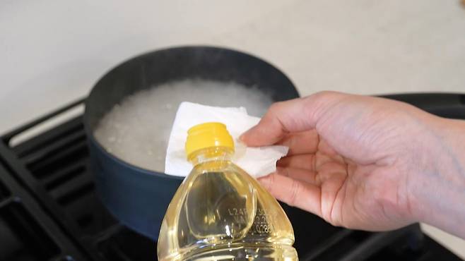 이제는 나무 국자가 아닌 식용유를 활용해 보세요. 먼저 키친타월에 식용유 적당량을 묻혀 주세요.