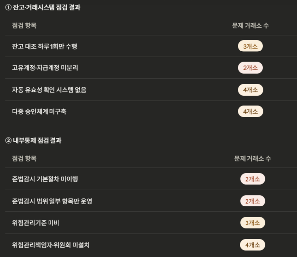 금융위·금감원·금융정보분석원(FIU)·DAXA가 공동으로 긴급대응반을 꾸려 5대 거래소를 한 달간 들여다보자 빗썸만의 문제가 아니었음이 확인됐다. 3개 거래소는 장부와 지갑 보유량을 하루에 한 번만 대조하고 있었다. 사고가 나도 몇 시간 뒤에야 알 수 있는 구조였다. 4개 거래소에는 담당자 입력값이 사전 지급 계획과 다를 때 자동으로 걸러내는 시스템이 없었고, 2개 거래소는 회사 고유계정과 이벤트 지급 계정조차 따로 관리하지 않았다. 준법감시인이 내부통제 현황을 점검하고 이사회에 보고하는 기본 절차를 빠뜨린 거래소도 2곳이었다.