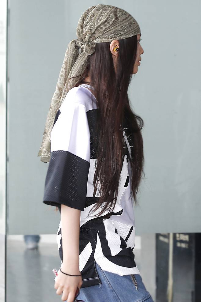 청바지에 오버핏 티셔츠에 청캡모자를 쓰고 나타난 민지는 손수건을 바지춤에 걸고 90년대 힙합 패션을 떠올리게 하는 패션을 선보였다.