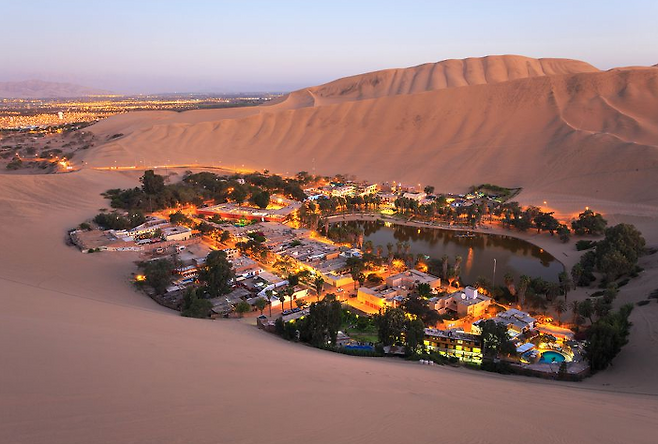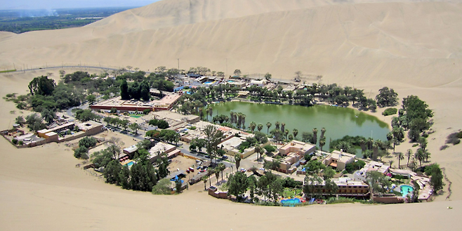 와카치나(Huacachina) 오아시스는 페루 이카 부근에 있는 오아시스입니다. 원래 페루해안가 사막지대에도 안데스산맥의 만년설이 녹아 지하로 스며든 물이 솟는 오아시스가 여럿 있었지만 농업용수로 혹은 생활용수로 끌어쓰다보니 모두 말라버리고 이제는 와카치나 오아시스 하나만 남아 있습니다.