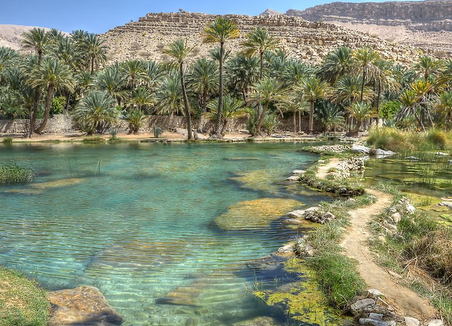 와디란 건기에는 말라있다가 우기에는 강처럼 흐르는 계곡을 말하는데, 오만에 있는 와디 바니 칼리드 (Wadi Bani Khalid)는 고농축 미네랄로부터 색상 (녹색과 적색)을 얻는 다채로운 암석 지층을 보유하고 있습니다.