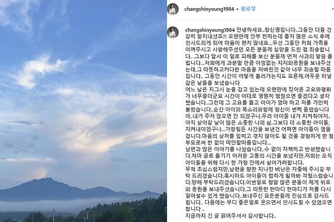 이후 지난 19일 장신영이 강경준 불륜 의혹 후 첫 심경글을 올렸습니다.
