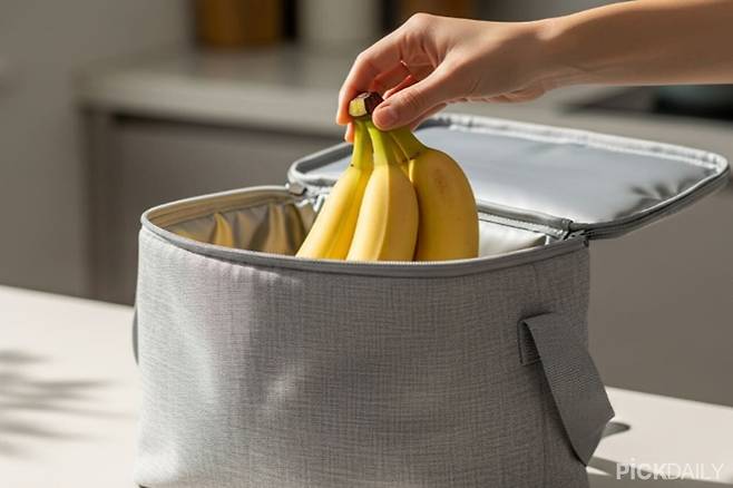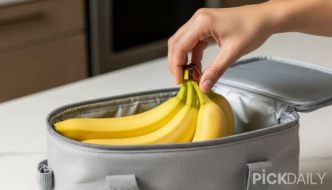 보냉백에 넣어도 효과 있습니다. 바나나를 보냉백에 넣어서 보관하는 것도 신선도 유지에 도움 됩니다. 온도 변화를 줄여주고 습도도 일정하게 유지돼요. 보냉백 없으면 지퍼백에 넣어도 괜찮습니다.