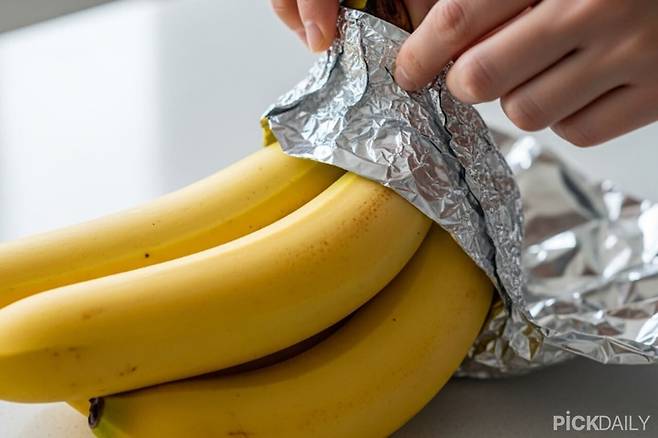 아님 꼭지에 호일을 감싸주세요. 바나나 꼭지 부분에서 에틸렌 가스가 나옵니다. 이게 바나나 숙성을 빠르게 만드는 물질이에요. 꼭지에 은박 호일 감싸주면 에틸렌 가스가 나오는 걸 막아서 후숙이 느려집니다. 그만큼 오래 먹을 수 있어요. 호일 없으면 랩으로 감싸도 비슷한 효과 있습니다.