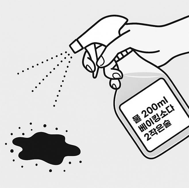 - step 2. 베이킹소다 스프레이하기__스프레이 용기에 물 200ml와 베이킹소다 2작은술을 넣고 잘 섞은 뒤, 오염 부위에 고르게 분사한다.