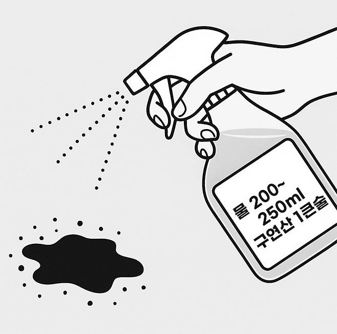 - step 2. 구연산 스프레이하기__스프레이 용기에 물 200~250ml와 구연산 1큰술(약 5~8% 농도)을 넣고 완전히 섞은 뒤, 오염 부위에 고르게 분사한다. 참고로40℃ 이상의 뜨거운 물을 사용하면 더 잘 녹는다.