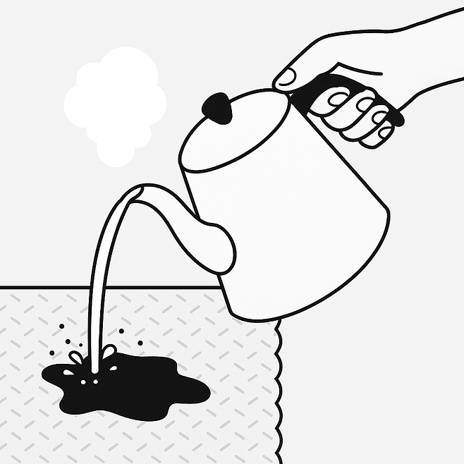 그다음 약 70~80℃ 정도의 뜨거운 물을 오염 부위에 소량 붓고 종이 타월로 눌러가며 수분을 흡수한다. 뜨거운 물은 얼룩과 냄새를 불리는 데 도움이 되므로 이 과정을 반복한다. 다만, 카펫이나 러그에 뜨거운 물이 닿으면 손상될 수 있으니 반드시 소량부터 테스트해 보는 게 안전하다. 마지막으로 습기가 남지 않도록 꼭 완전히 말려준다.