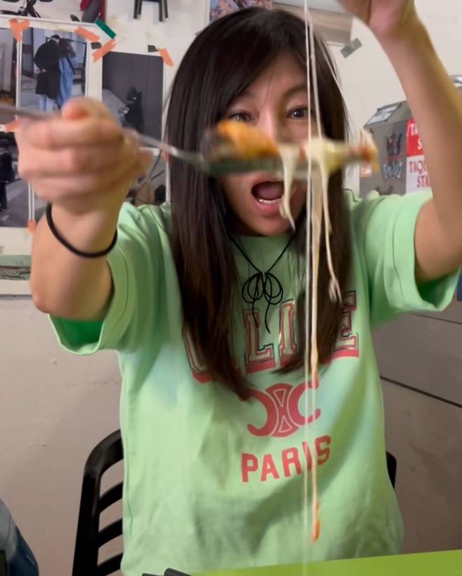 황신혜는 빨간색 로고 프린트가 보색 대비를 이룬 형광빛 녹색 티셔츠로 스타일리시하고 유니크한 패션을 선보였습니다.