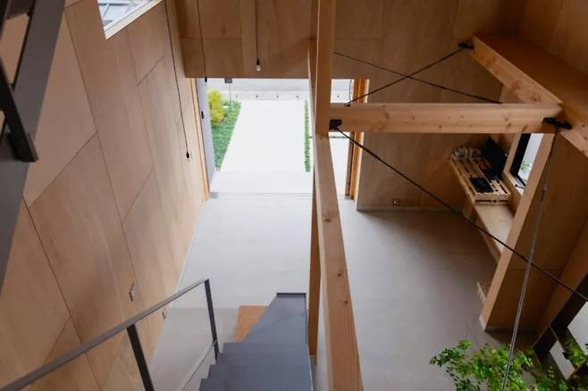 집 안으로 들어가면 이러한 의도가 명확히 드러난다. 넓게 열린 1층은 침실도 거실도 아닌, '도마'라 불리는 커다란 현관형 공간으로 구성되어 있다. 흙을 연상시키는 마감재와 높은 천장은 외부의 마당이 실내로 들어온 느낌을 준다.