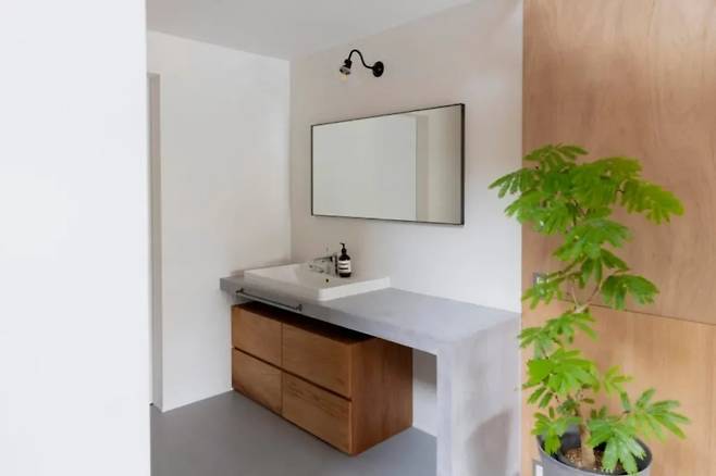 외벽 쪽에는 얕은 벽장이 설치되어 있어 자질구레한 물건들을 깔끔하게 정리할 수 있다. 이 공간은 효율성과 미니멀리즘의 조화를 보여준다.