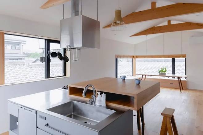 거실, 주방, 다이닝 공간이 모두 3층에 배치된 이유는 단 하나, '뷰' 때문이다. 주변 지역이 낮게 형성되어 있어서 이 집의 3층에서는 교토의 푸른 산과 저녁노을을 감상할 수 있다.