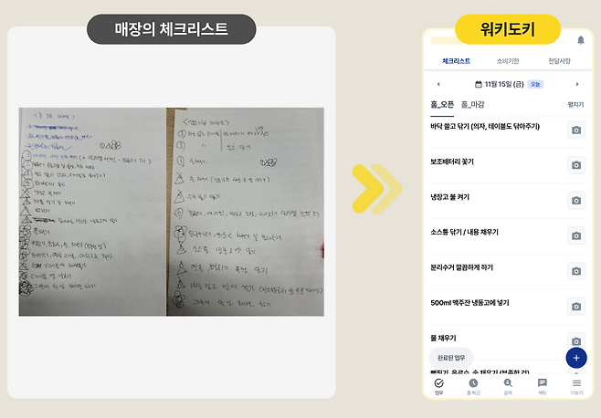 그렇게 탄생한 ‘워키도키’는 매장 관리에 필요한 기능을 하나로 통합한 애플리케이션(앱)이다. 처음엔 체크리스트 기반의 업무 관리로 출발했다. 사장이 매일, 주간, 월간으로 해야 할 일을 설정해두면 알바생이 이를 수행하고 사진을 찍어 인증하는 방식이다. 이를 통해 누가 언제 업무를 했는지 명확히 기록이 남아 업무 누락에 따른 손실을 획기적으로 줄일 수 있다. 알바생은 자신의 업무 영역을 명확히 알 수 있어 ‘잔소리’ 들을 일 없이 보다 편하게 일할 수 있다. 개인 메신저로 불편한 연락을 주고 받을 필요도 없다.