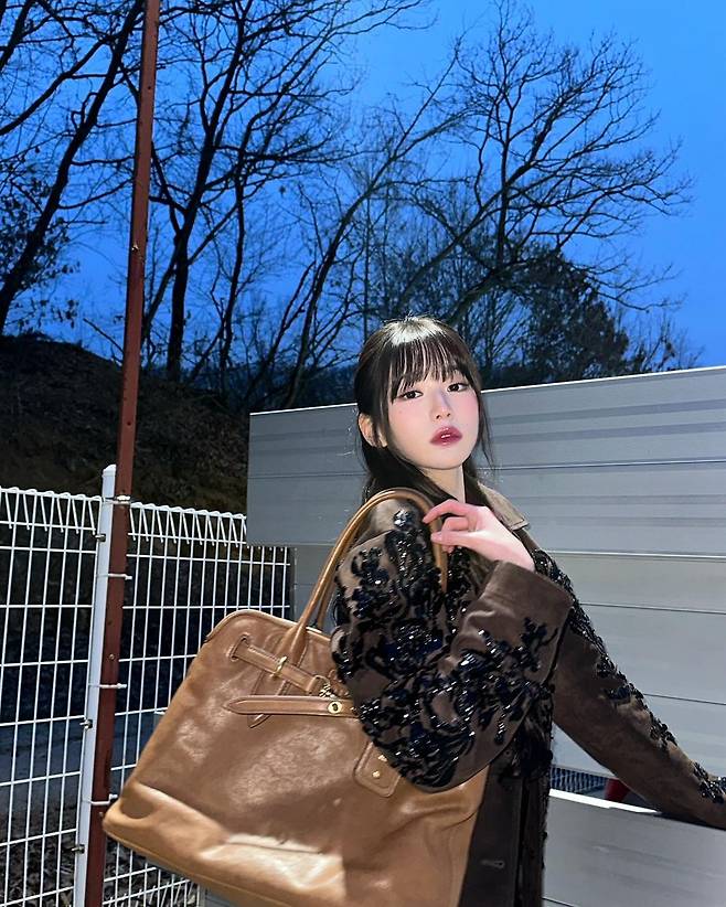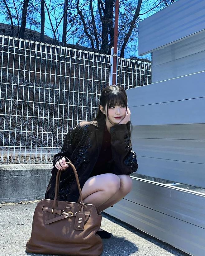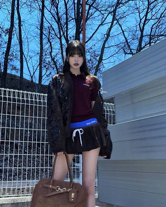 사진 속 장원영은 와인색 카라티와 블랙 짧은 반바지를 입고 스팽클이 달린 브라운 자켓을 입고 긴 기럭지를 자랑했다.