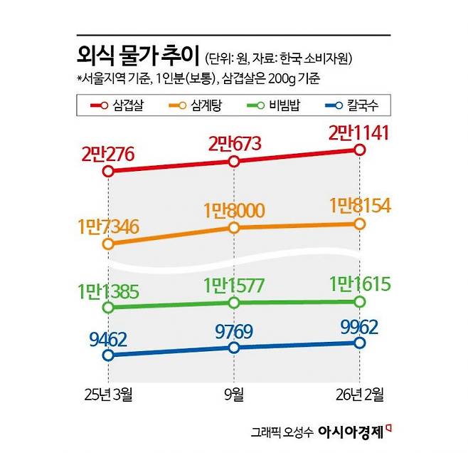 6일 한국소비자원 가격정보종합포털에 따르면 올해 2월 서울 지역 김밥 한 줄 가격은 3800원으로, 1년 새 7.4% 올랐다. 칼국수(9962원)·삼계탕(1만8154원)도 각각 5.3%·4.7% 뛰었다. 서민 메뉴로 여겨지던 비빔밥은 1만1615원, 냉면은 1만2538원으로 집계됐다. 최근 중동 사태에 따른 고유가·고환율 여파가 더해지며 물가 불안이 장기화할 거란 분석도 나오고 있다.