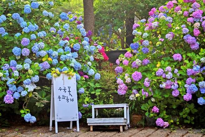 태종대 수국길은 태종사 입구에서 시작해 다누비 열차 노선 일부와 겹치는 구간을 따라 이어진다. 가장 유명한 장소는 ‘태종사’ 경내와 그 앞 언덕길로, 이곳은 부산 수국축제가 열리는 주무대이기도 하다. 축제는 매년 6월 말 무렵 개최되지만, 수국 개화는 5월 하순부터 시작되어 6월 초에 절정을 이룬다.