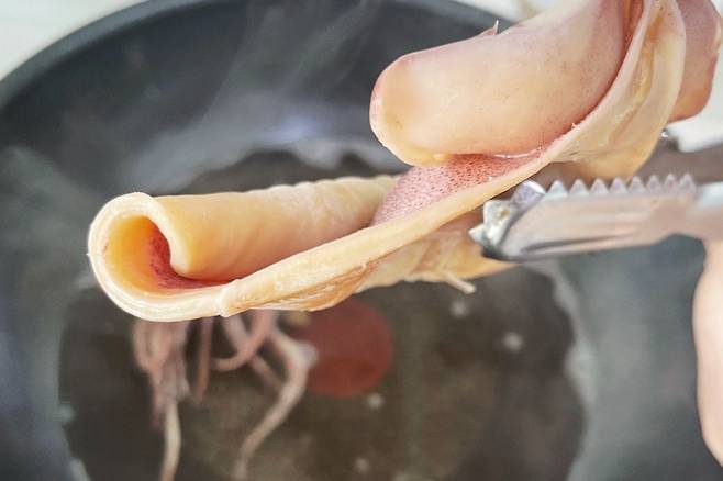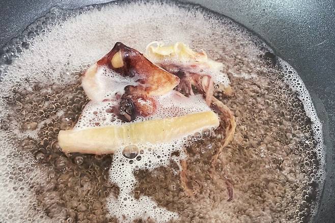 그러면 오징어가 반건조 오징어처럼 부드러워지고 맛있는데요. 끓이면서 보시면 오징어 통통해져요