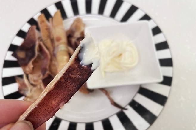 마요네즈 찍어 먹어보니 정말 말랑말랑 부드러워요. 설탕물이라 단맛이 나지 않을까 싶었지만 단맛은 전혀 없고 오히려 짠맛이 제거되어 담백했답니다. 반건조 오징어보다 식감은 더 쫄깃해서 만족스러웠어요. 마른오징어 씹기 딱딱하다면 이 방법 활용해 보세요^^*