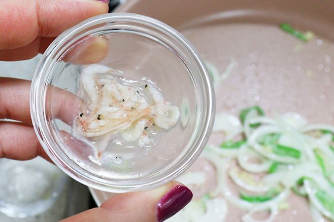 새우젓 1큰술을 넣고 1~2분 정도 더 볶습니다. (너무 오래 볶으면 물이 생겨요.)