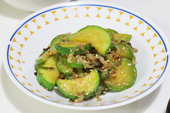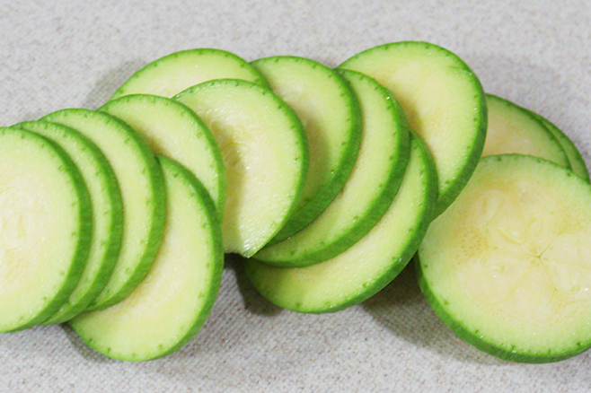 애호박은 반으로 갈라 어슷하게 썰고, 키친타월로 살짝 물기를 닦아요.