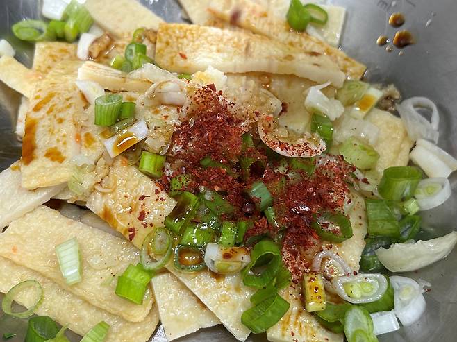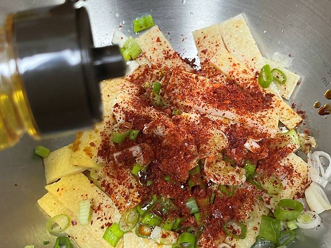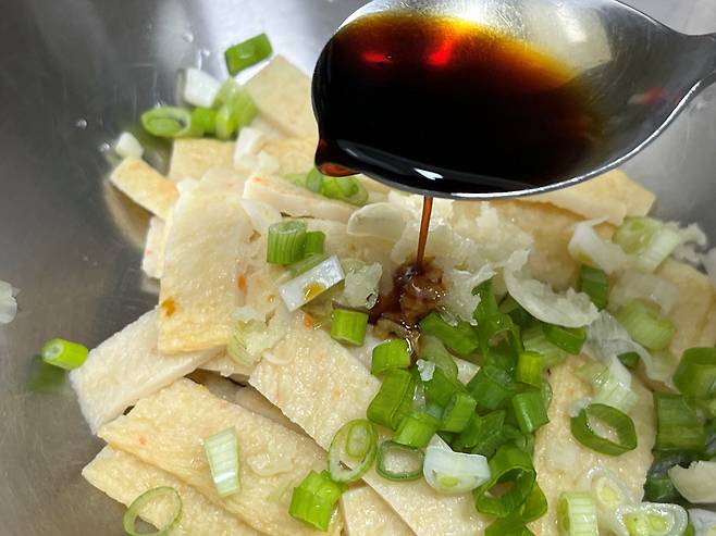 뜨거운 물에 담갔던 어묵을 양념 넣고 간단하게 무치면 금세 맛있는 어묵 반찬이 완성됩니다. 기름에 볶지 않아 훨씬 깔끔하고 담백한 맛이 납니다.