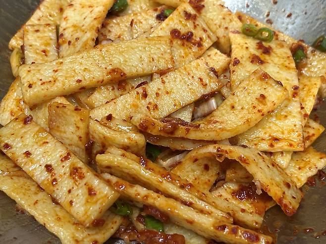 양념이 어묵에 골고루 배도록 잘 섞어 주세요. 특히 고춧가루는 뭉치는 곳이 없도록 잘 풀어서 무칩니다.