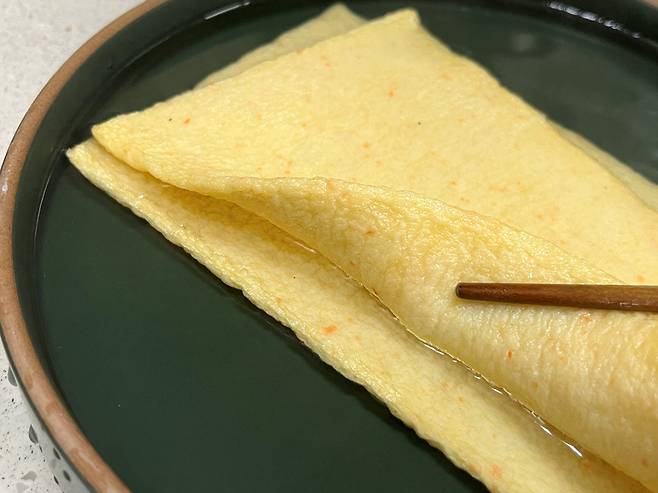 어묵 2장에 뜨거운 물을 붓고 2분 기다립니다. 어묵에 뜨거운 물을 부으면 표면에 남아 있는 기름기와 첨가물이 제거되어 맛이 깔끔해집니다.