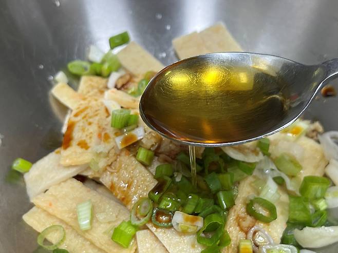 참기름이나 들기름 1스푼을 추가해 고소한 맛을 더해 줍니다. 어묵 반찬에는 간장, 마늘, 참기름(들기름)은 꼭 들어가야 맛있습니다.