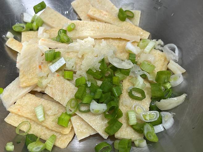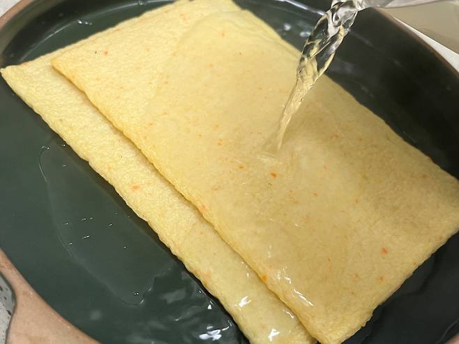 어묵 2장에 뜨거운 물을 붓고 2분 기다립니다. 어묵에 뜨거운 물을 부으면 표면에 남아 있는 기름기와 첨가물이 제거되어 맛이 깔끔해집니다.