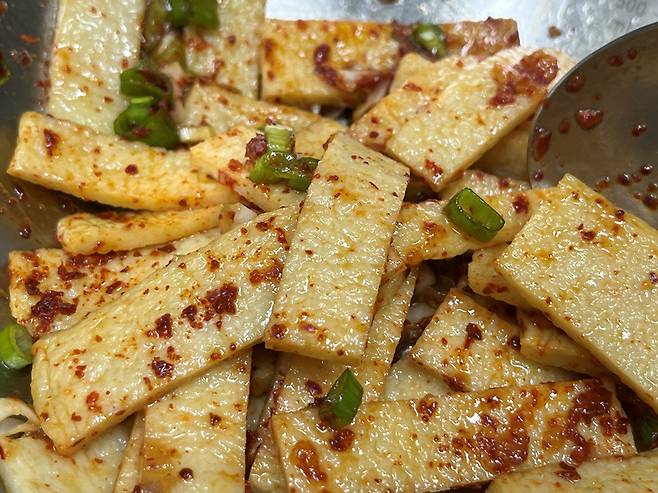 뜨거운 물에 담갔던 어묵을 양념 넣고 간단하게 무치면 금세 맛있는 어묵 반찬이 완성됩니다. 기름에 볶지 않아 훨씬 깔끔하고 담백한 맛이 납니다.