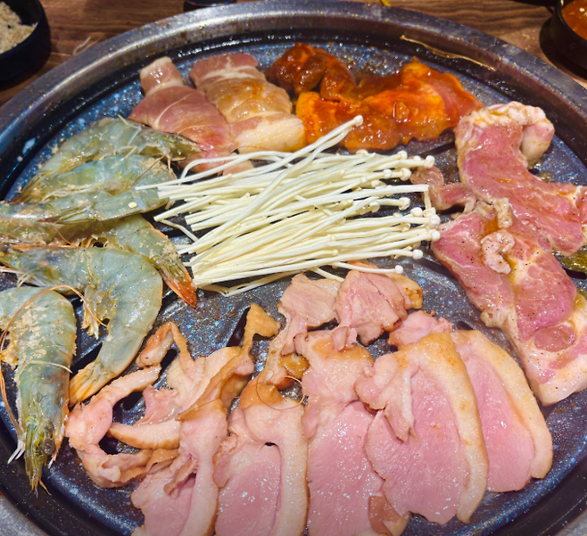 삼겹살, 목살, 항정살, 가브리살, 대패삼겹살, 양념갈비 등 6종의 고기와 새우까지 무제한으로 제공됩니다.