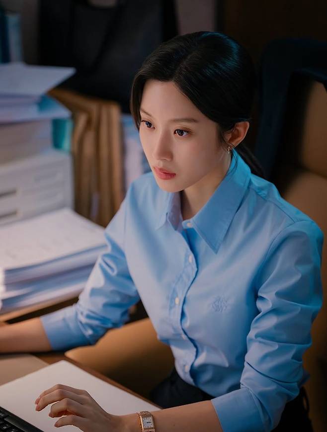 문가영의 인스타그램 속 청량한 한 컷이 타임슬립을 부른다. 촘촘히 쌓인 서류 더미 옆, 청명한 하늘빛 셔츠를 입고 모니터를 응시하는 그녀의 모습은 90년대 초중반 오피스룩의 전형 같으면서도 동시에 세련된 현대적 감각을 담고 있다. 파스텔 계열의 단정한 셔츠는 심플한 버튼 라인과 테일러드 칼라로 정갈함을 강조하며, 소매를 자연스럽게 걷어 올린 연출은 여유로운 실루엣과 실용성을 모두 챙긴다.