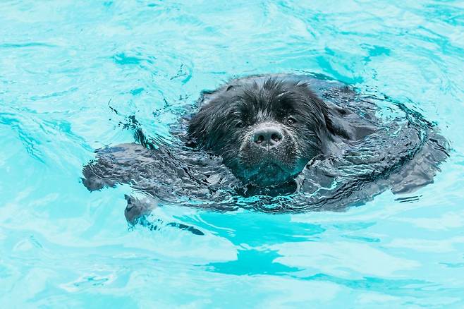 뉴펀들랜드는 수영을 아주 잘 하는 견종이에요. 발가락 사이의 뚜렷한 물갈퀴, 높은 폐활량, 방수되는 털 등 수영하기 아주 적합한 신체 구조를 가지고 있다고 해요.