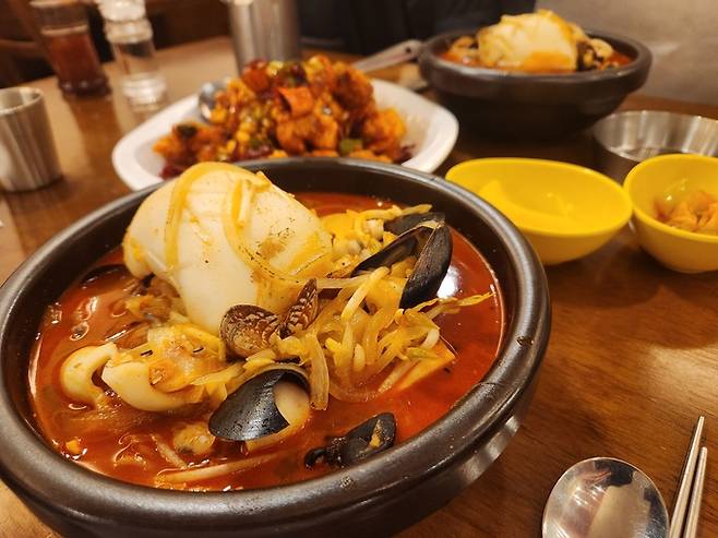 한 마리가 통째로 들어있는 갑오징어가 가장 먼저 눈에 들어온다. 홍합, 바지락 등 해산물이 가득하다. 여기에 콩나물, 양파와 같은 갖은 채소가 어우러진다. 뜨거운 국물을 후후 불어 먼저 맛본다. 사골 육수로 만들어 깊은 맛이 느껴진다. 진한 국물을 몇 숟갈 떠먹다 보면 속이 풀리는 느낌을 받는다. 맵지 않고 부드러운 국물이 속을 편안하게 해준다. 갑오징어를 먹기 좋게 가위로 자른다. 면발도 나무랄 데 없이 쫄깃쫄깃하다. 후루룩 먹다 보면 순식간에 한 그릇을 뚝딱 비우게 된다. 맵거나 짜지 않고 담백한 맛이다. 면이 당기지 않는다면 밥도 좋다.