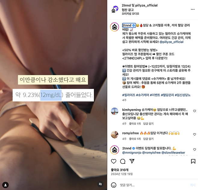 개인화 영양 관리 플랫폼 브랜드, '필라이즈'가 10만 팔로워의 인스타그래머인 '이승희'님에게 제품 협찬을 진행한 이야기도 흥미롭습니다. 얼마 전, 필라이즈는 자체적으로 체험단 모집을 했다고 하는데요. 최근 출산 후 당뇨와 고지혈증으로 고생하던 이승희님이 필라이즈를 사용하고 있었고, 체험단에 신청을 했다고 해요. 심지어, 체험단에 신청한 이야기를 블로그에도 공개했다고 합니다.