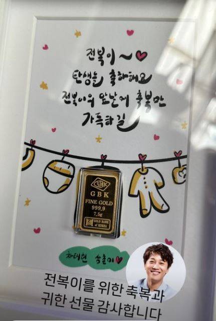 특히 “전복이를 위한 축복과 귀한 선물 감사합니다”라는 글과 함께 공개된 사진에는 특별한 선물이 담겨 있었다. 바로 배우 차태현이 준비한 7.5g 골드바였다.