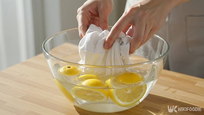 방법은 커피가 묻은 직후라면 휴지나 마른 천으로 가볍게 눌러 여분의 액체를 먼저 제거한다. 그런 다음 레몬 껍질의 속 하얀 부분이나 즙이 배어 있는 노란 껍질 부분을 얼룩 부위에 문지른다. 구연산이 직접 닿으면서 색소가 조금씩 분해돼 얼룩이 옅어지는 과정을 볼 수 있다.